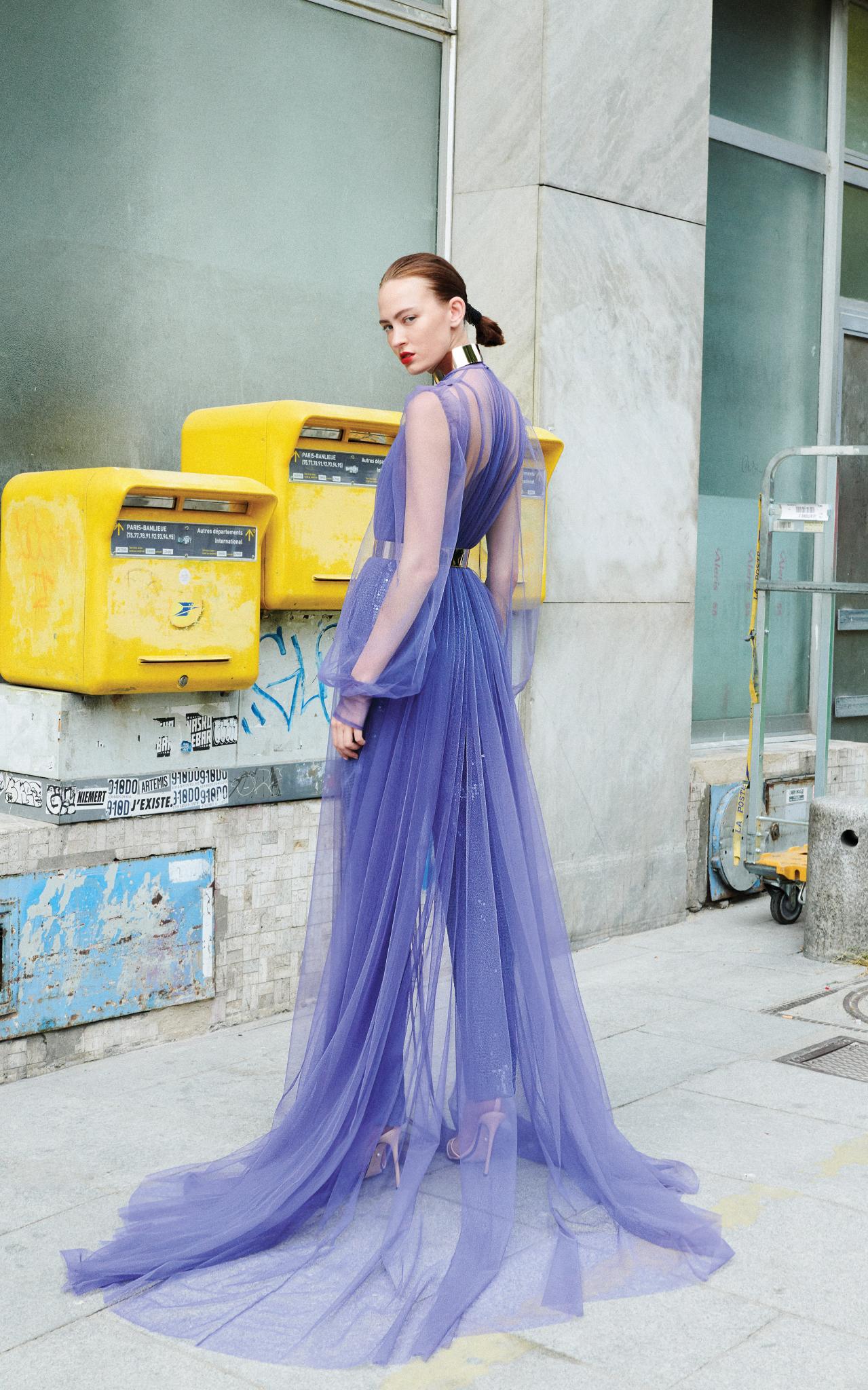 Old Hollywood glam returns with Elizabeth Tailor– a dress that adds modernity to preceding decades. Violet hues dazzle, complemented by touches of gold hardware. Organza alludes to a delicateness, contrasted by trousers.