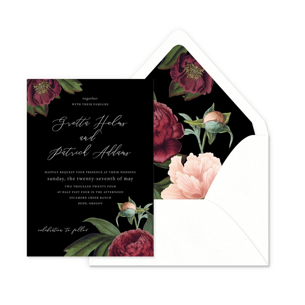 Picture this: You’re the leading lady in an epic romance. Channel your story through rich floral hues and a mood-setting onyx background. The stunning floral artwork on the card links back to the intricate embroidery and 3D appliquéd bodice and long illusion sleeves on your gown — and maybe even matches your centerpieces. Gold foil accents bring the glamour.