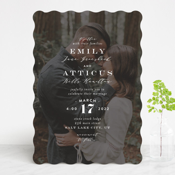This elegant and refined invitation design is fit for a queen — that’s you — to kick off your own version of a Royal Wedding. But you’re giving your princess gown a modern twist with an inspired and unexpected handkerchief hem. The card’s gilded overlay frame links back to the contemporary irregular ballgown skirting, but the classic black and white classic lettering harkens back to tradition. Can’t you picture this invitation being delivered on a silver tray by an old timey butler?