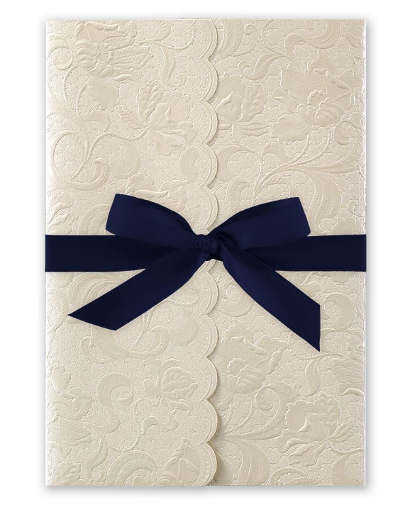 Like flipping the cover of a children’s classic tale — or opening a royal decree in your favorite bedtime story — lifting the double gate fold on this invitation will bring a rush of anticipation and excitement for your wedding day. The satin rose ribbon matches the romantic ice pink hues of your dress — plus, the floral embossed texture creates a throughline to the 3D blossoms trickling down the bodice, draped shoulder straps and ethereal tulle layers of your fantastical gown.