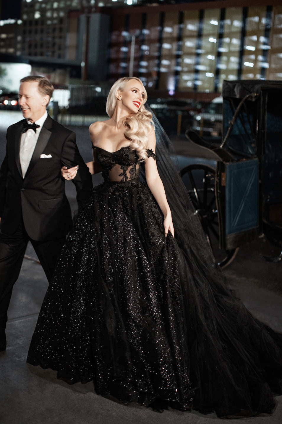 For the gothic winter wonderland-themed affair, Quinn arrived in a black horse-drawn carriage wearing a Cinderella black wedding dress featuring a sheer, off-the-shoulder bustier top and sparkling skirt with rose embroidery.