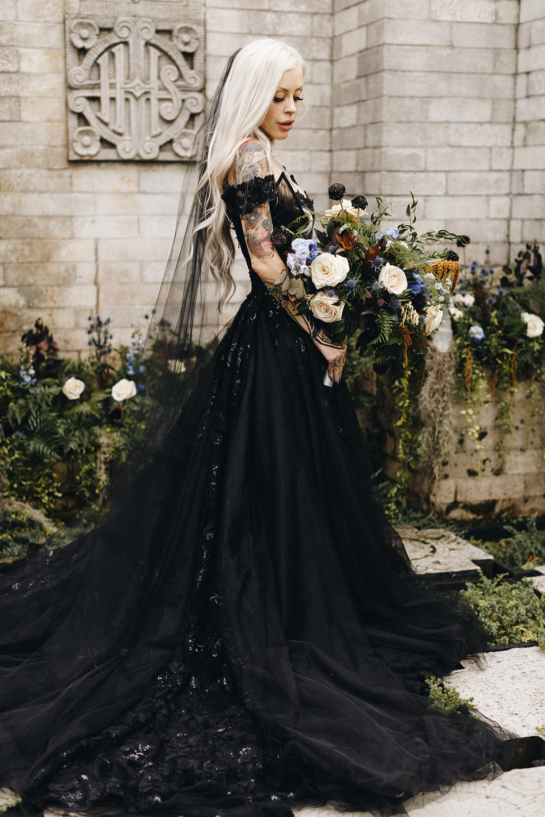 Social media personality TJ Marino also wore a black gown for her September 2022 nuptials. Her corset black wedding dress had a partially sheer bodice and 3D floral details with a touch of sparkle, creating a perfectly bold-yet-romantic look.