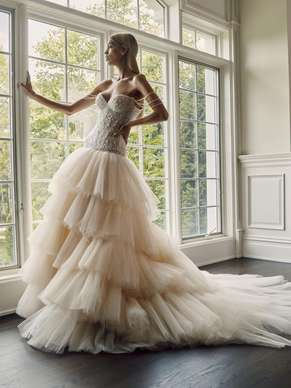 Our blush dresses come in every style you could imagine: as a gem-encrusted corset with a tiered tulle skirt, in the form of a flowing strapless gown with an embroidered floral overlay and even a sheer barely-there number with a plunging neckline. Here, find 10 of our favorite blush dresses of the moment.