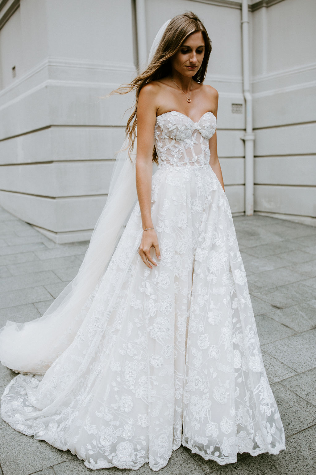 Our #GLBride of the week is the lovely Amanda Moriarty, who walked down the aisle to marry her fiancé Tiaan in our Georgia gown. The two exchanged their loving vows in front of family and friends at the St Patrick’s Cathedral and held an unforgettable walk-through reception at the Auckland Art Gallery. In the following interview, Amanda shares with us the behind-the-scenes details of her special day and the moment she fell for our Georgia dress. As told by Amanda: