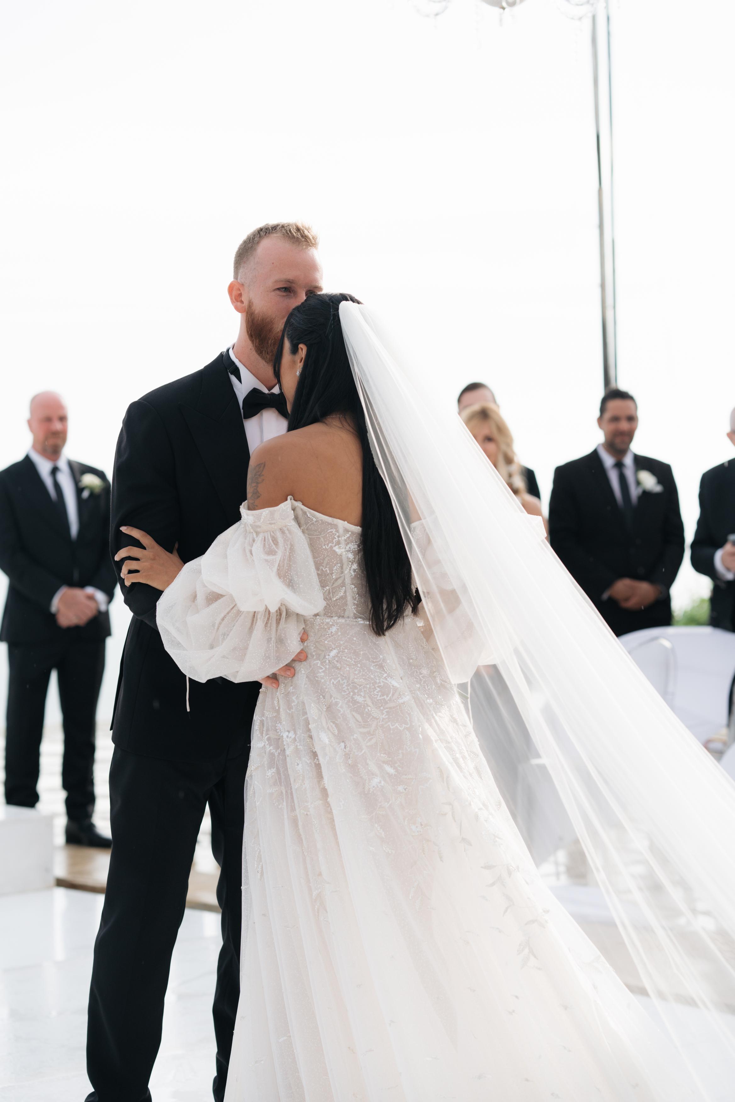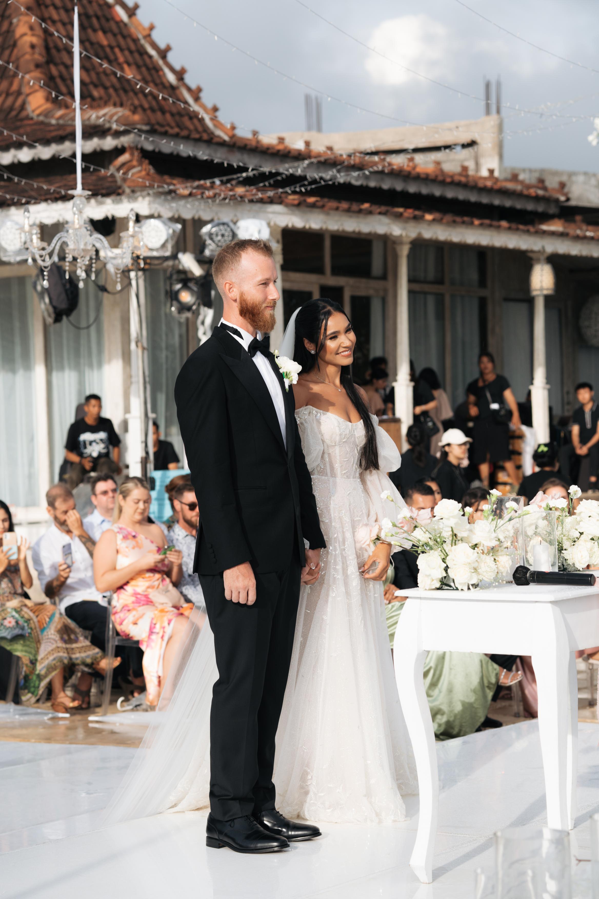 With Talia, I customized the back to a lower back and made a couple of changes, and for the Mel Gown, it was already perfect. I only asked for a longer train, so they made it about 20cm longer, I believe. We decided to get married in Bali because we love that place so much and we went there to celebrate our engagement. The restrictions were still in place until July 2023, so we decided to book the 24/04/24 for our wedding in Bali Uluwatu, the island of the Gods, in a place that looked just like heaven. It was the best day of our lives, and we even had a rain stopper; that I believe stopped the rain just before I walked down the aisle, and the sun shined over me.