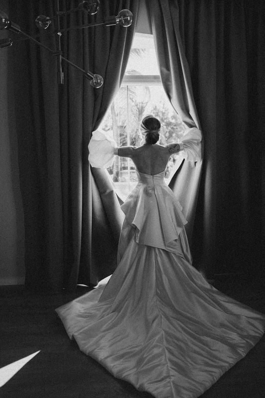 I was really torn about what to wear for my second dress. I knew I wanted to create something that contrasted the sleek and classic look of my ceremony gown, but nothing was feeling quite right and I was dragging my feet on making a decision. Our Head Designer Sharon absolutely saved the day on this one! I showed him some inspo pics during one of his visits to our showroom and after a little back and forth, he designed the most fabulous bow attachment for the Polly gown. It was like he read my mind! And I felt so honored to wear something totally one-of-a-kind made by someone I admire so much.