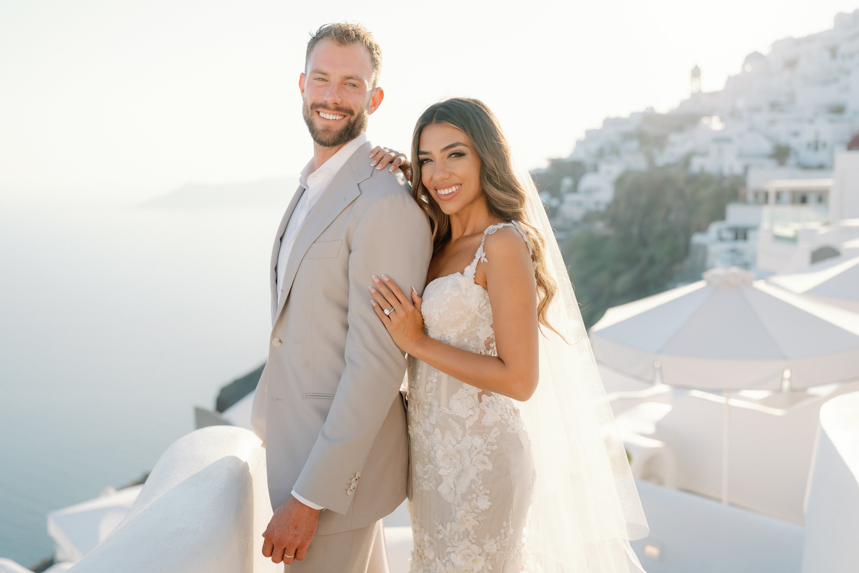 Our wedding day was a masterpiece of elegance and celebration, split between two stunning venues. The ceremony took place at Santorini Gem, where I walked down the aisle to the enchanting melodies of a violin and harp, with the caldera providing a dramatic backdrop. The reception at Erosantorini, a renowned high-end villa, was nothing short of spectacular. We delighted our guests with fire flame dancers, mirror bunnies, disco ball dancers, and a stunning fireworks display.