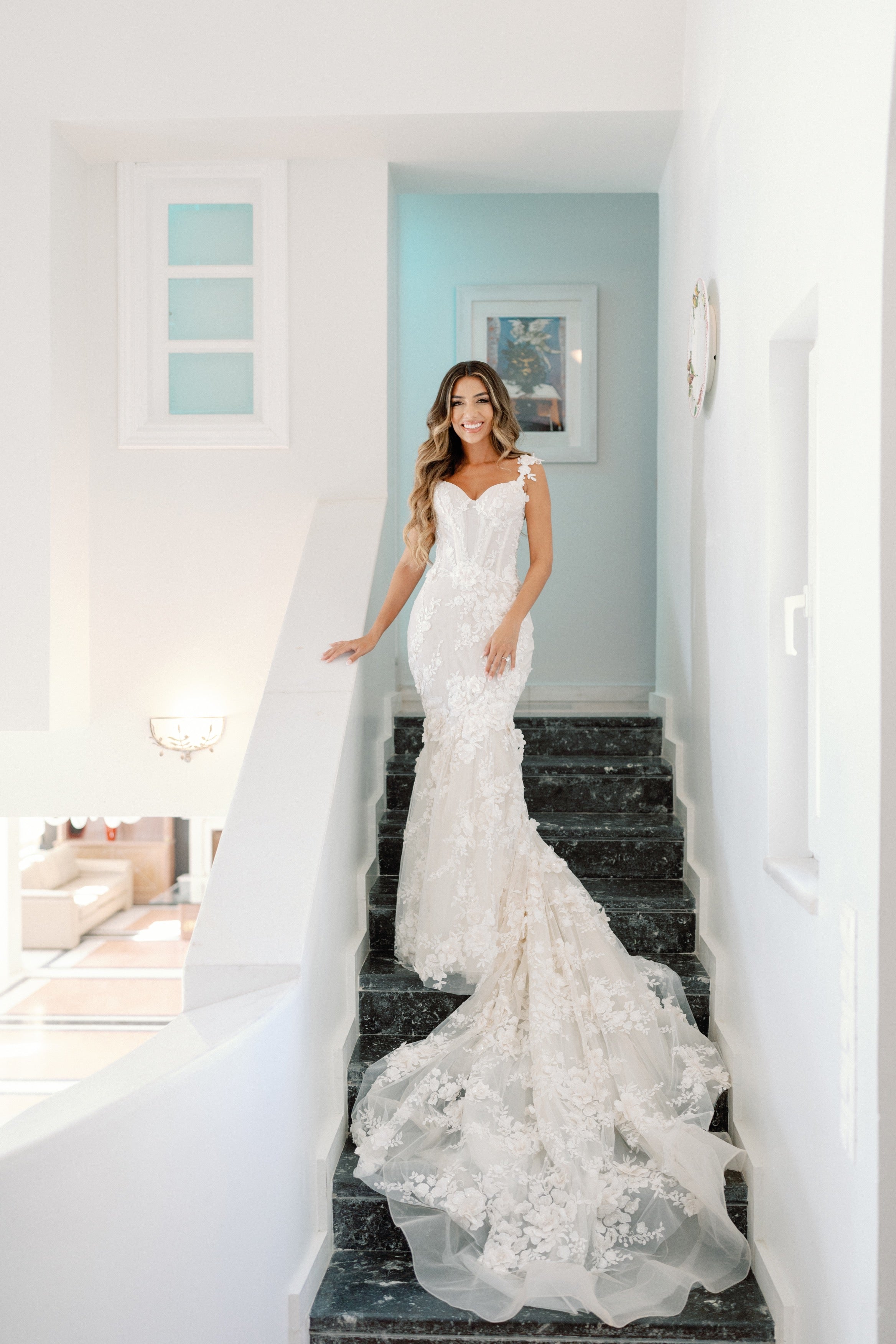 Every dress I tried on at Galia Lahav was a dream come true, but then I slipped into the G-104 custom gown. It was the epitome of perfection, destined for my Santorini backdrop. As I stood there, my mom, who had seen me in countless dresses, shed tears for the first time. In that heartfelt moment, I knew this was THE dress—the one that would make my special day absolutely unforgettable.
