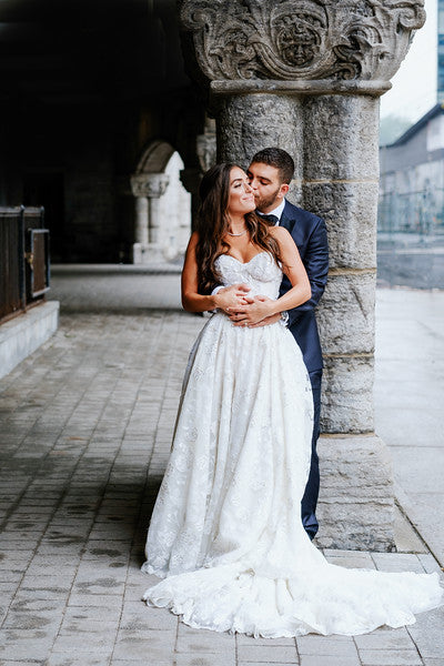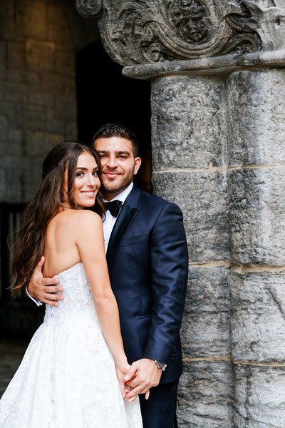 Our Bride of the week is the beautiful Erika Abitbol, who wore our Georgia gown as she married her fiancé Adam. The couple held their nuptials in their hometown of Montreal at one of the oldest synagogues in the city. In the following interview, Erika shares with us the details of her enchanting Lake Como themed wedding and how she found her fairy tale gown. As told by Erika: