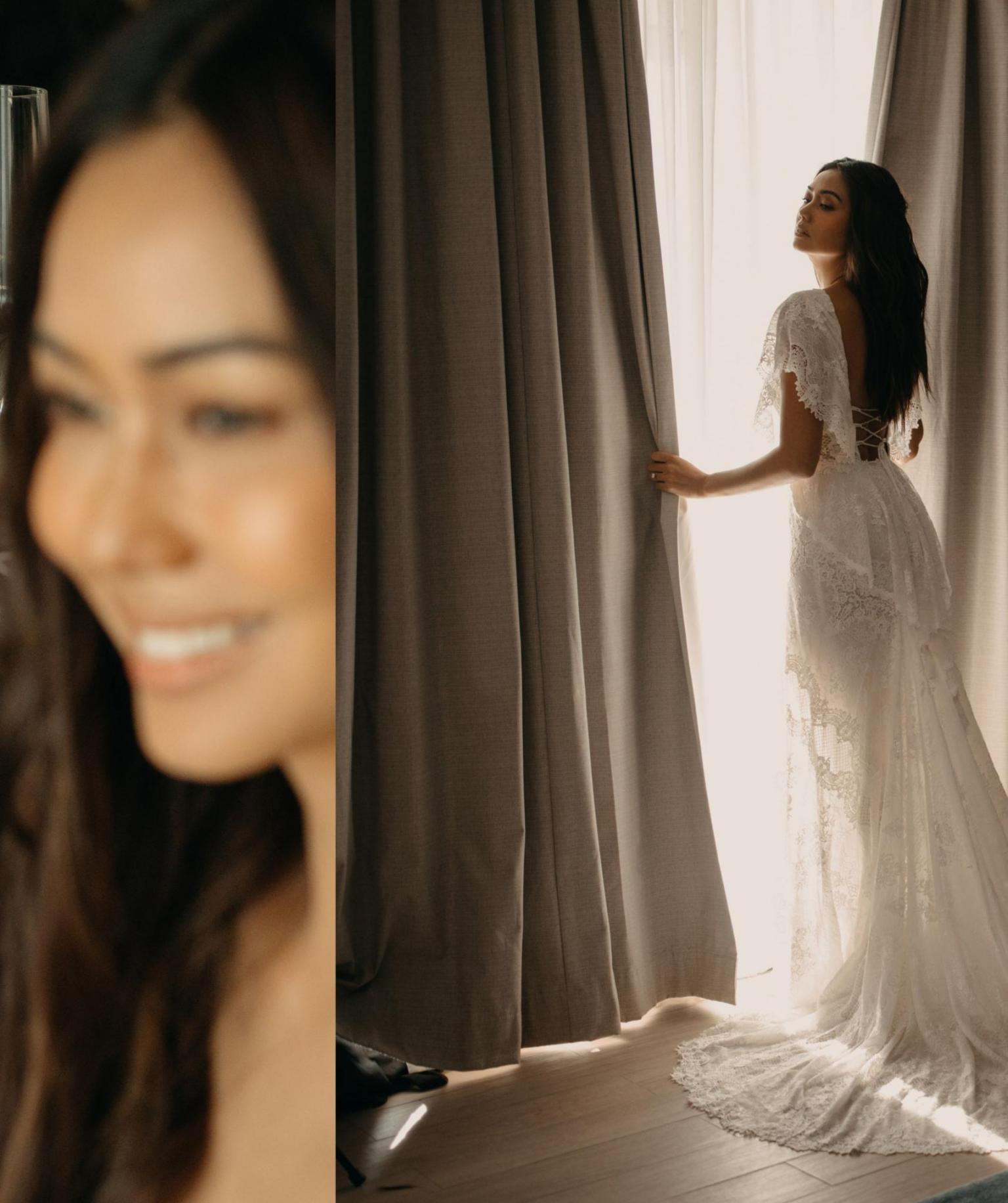 When I came back for my appointment, I tried on around 12 dresses from the Gala line—my wedding was going to be by the beach, hot and tropical, so Gala’s lighter fabrics suited me best. Once I put on the Gala 1003, I didn’t want to take it off, I got emotional (which I never thought would ever happen to me over a dress), and I remember saying to Anthony, “I could walk out of this store right now in this dress and marry my man and be happy.”