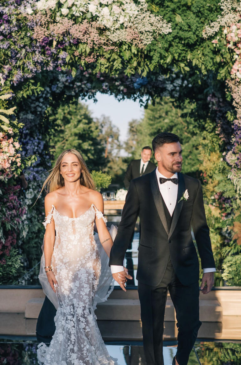 Illusion paneling on the angular corset and skirting felt modern — portending to an exciting future for the power couple — while the draped off-the-shoulder sleeve and caviar tulle train countered with a sweet, romantic vibe. As Tagliafico and Calvagni took their vows, the Lyon Club defender lovingly dabbed his soon-to-be wife’s happy tears with a tissue.