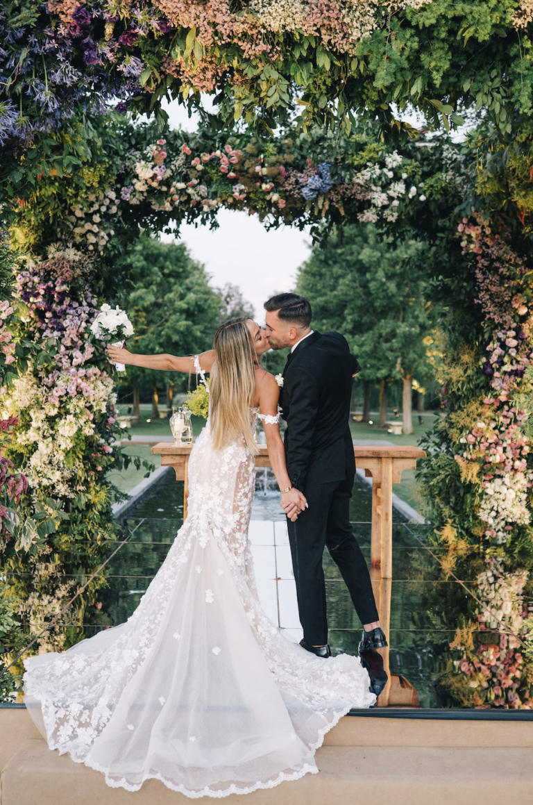 With her long and middle-parted hair worn down, Calvagni glowed in the Maya gown by Galia Lahav Couture. “My dream dress,” gushed the bride on Instagram. During the ceremony, on the sweeping grounds of the luxurious El Dok in Exaltación de la Cruz, vibrant flora and fauna framed the embroidered 3D flowers blooming on Calvagni’s gossamer sheer silk tulle mermaid gown.