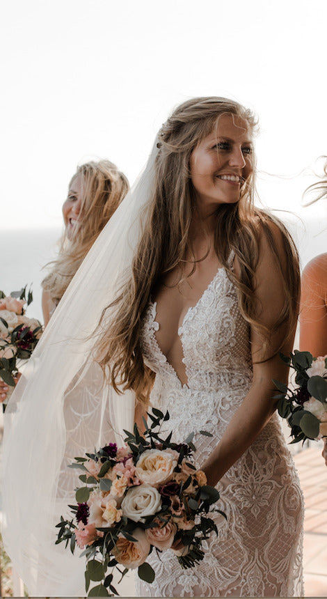 We love veils and would put a veil on almost every gown if we could! So naturally, we was thrilled when Galia starts to create matching veils to her dresses! We recommend matching the veil to the dress, of course, but the type of celebration can also have an impact on the choice of veil. If the location is imposing and luxurious, the veil may be accordingly glamorous; for a simple garden ceremony, a rather light, soft veil is the right option and for a civil wedding with a short dress a fun, puffy veil can be the right accessory.