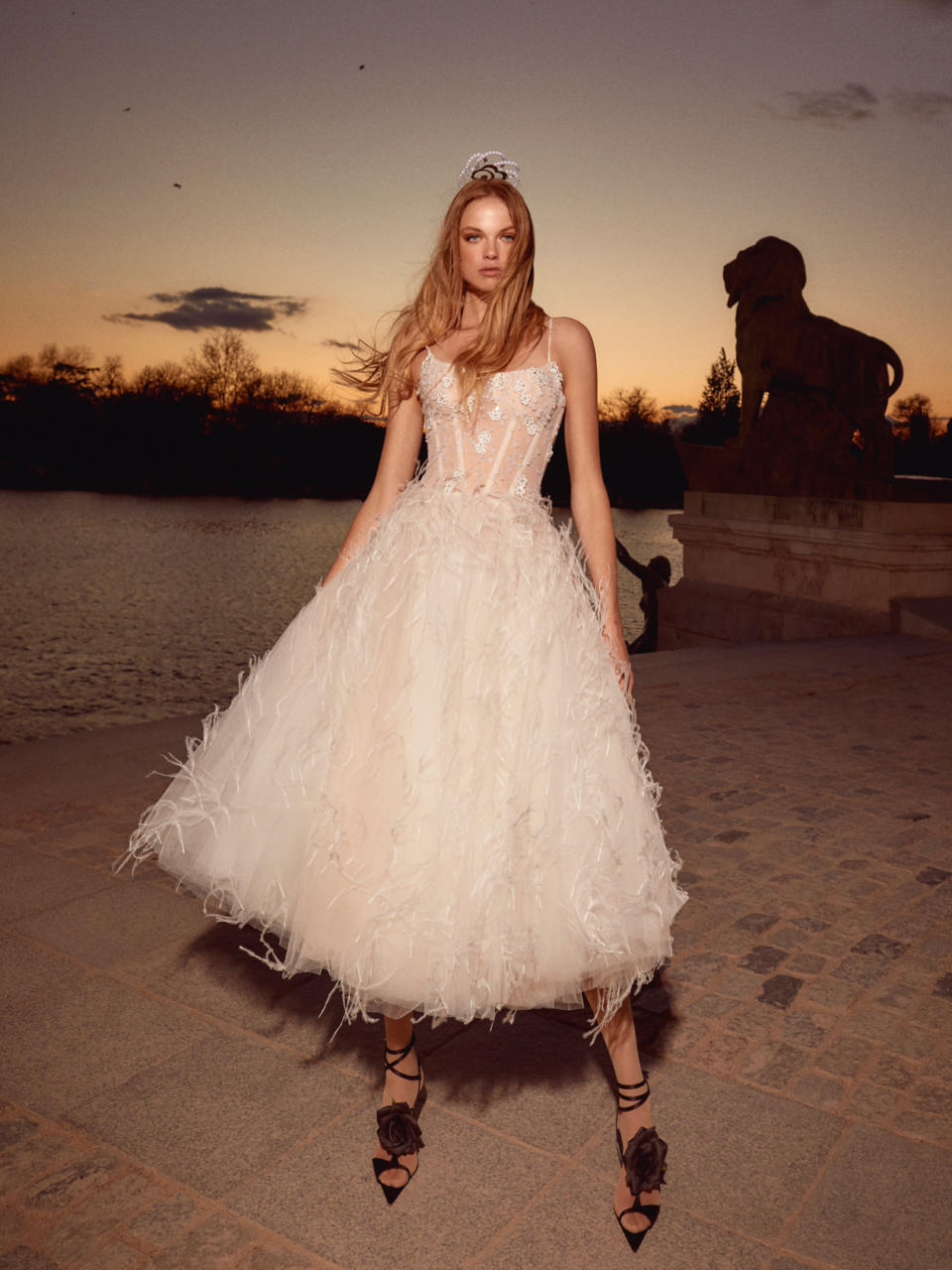 Every Galia Lahav dress comes with a garment bag – and we highly recommend using it during your travels, with a sturdy hanger supporting your dress inside. For bigger, bulkier dresses like Utopia, and those with very delicate embroidery ( Zendaya), appliques or pieces with volume, you’re going to want to transport the garment bag by tucking it carefully over your arm.