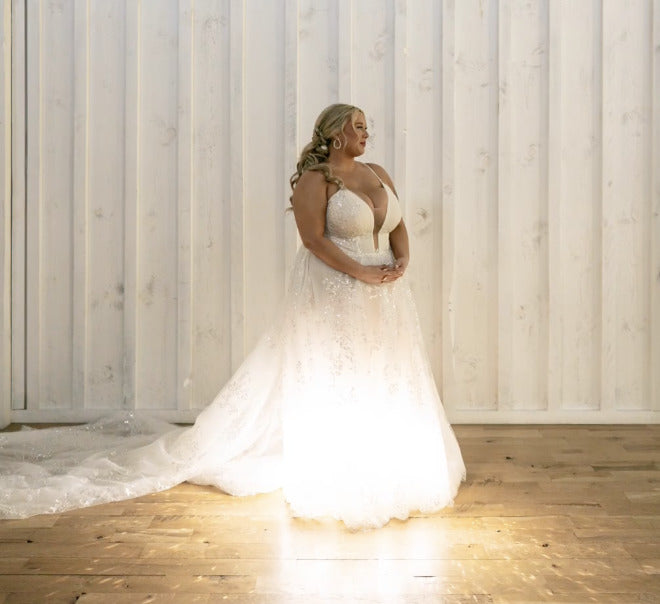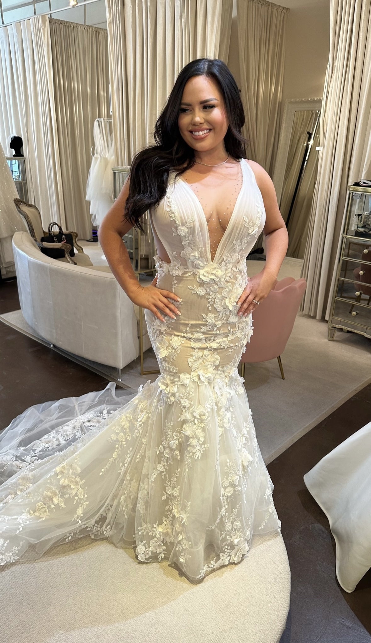 While Galia Lahav’s in-store size ranges go up to a US 18, plus-size brides can still make their dress dreams into a reality. The designers recommend doing a virtual consultation with a designer to discuss preferences and try dresses on virtually. Exploring plus-size bridal stores can also allow you a greater selection of styles to try in person. If you want to ensure your dress is a perfect fit, you can always work with an atelier to create a bespoke dress that is made to your exact measurements. A final piece of advice from the designers? “Remember, the most important thing is to choose a dress that makes you feel beautiful and confident on your wedding day,” they say. “So go forth, embrace your curves, and find the dress that makes you shine!”