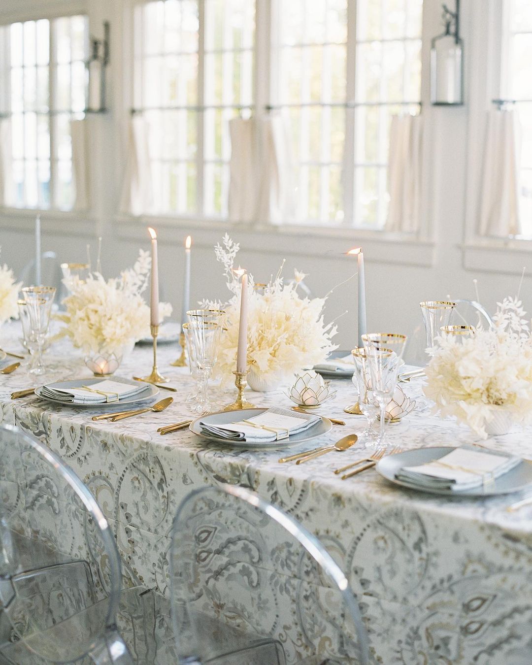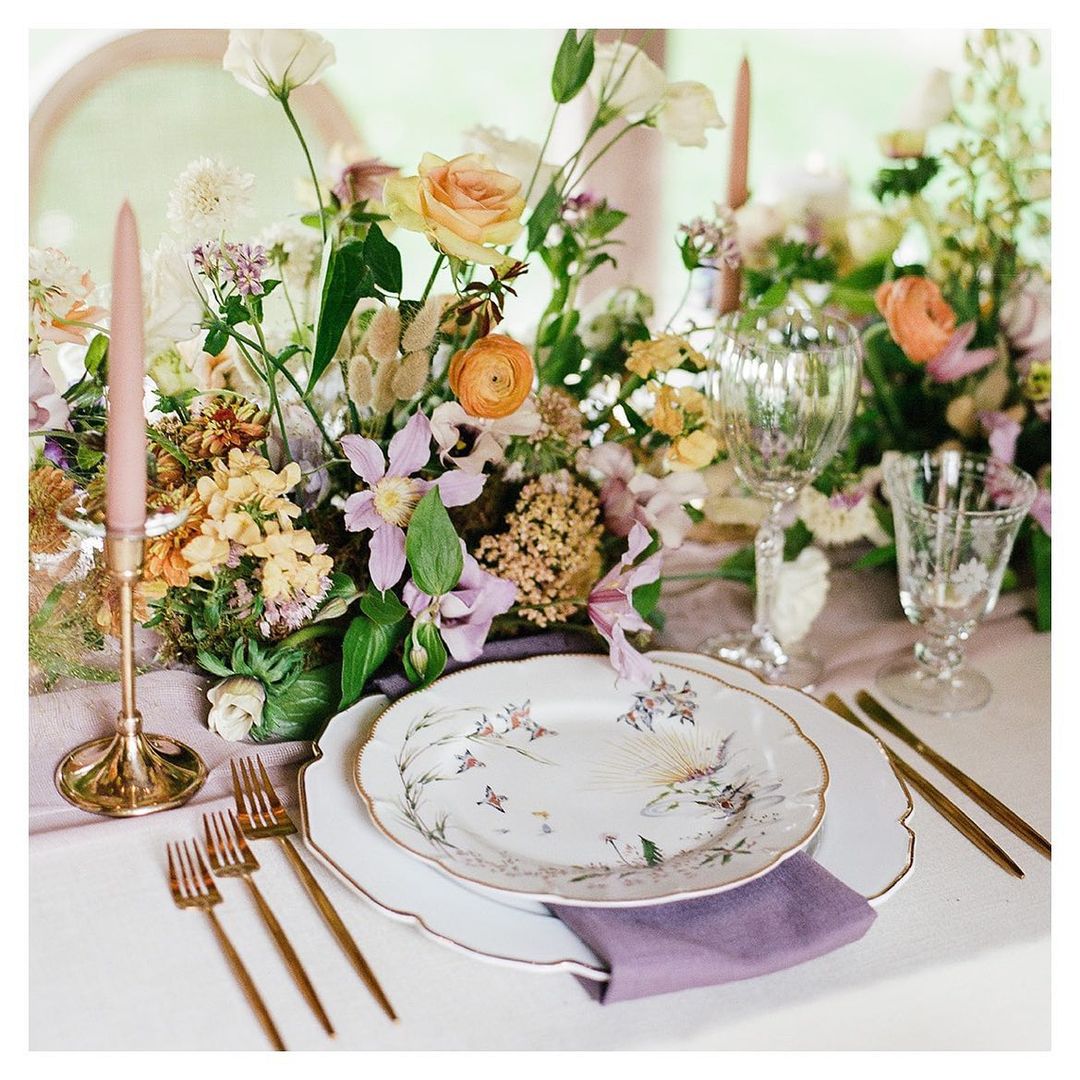 Investing in fine china for a party of 200? That can be tough. But when you’re planning a more intimate gathering, you can spring for whatever luxe dinnerware you want—without busting your budget. This tasteful bird print plate with gold edging is obviously the star of this boho chic tableau, but its vintage vibes are a welcome juxtaposition against those decidedly contemporary flowers (look closely to spot the trendy bunny tails grass). Gold touches tie the rest of the table together, while subtly detailed glassware adds a hint of timeless charm. Ah, just imagine how dreamy this dinner will look once those candlesticks are lit…