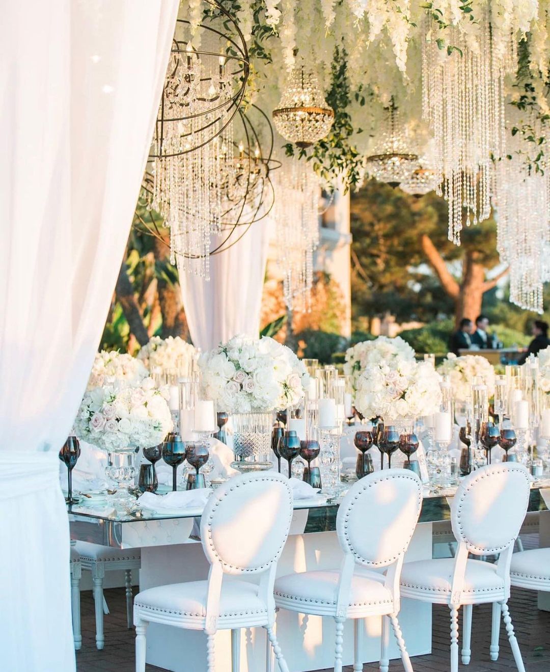 On the other hand, there’s nothing wrong with going for all-out glam in shades of white…including garlands, beads and chandeliers hanging from the ceiling. But adding one detail that really stands out from those hues of ecru and eggshell will make photos of your party even more memorable. In this case, it was oil slick stemware in dramatic shades of black, which serves as a welcome reminder to drink up!