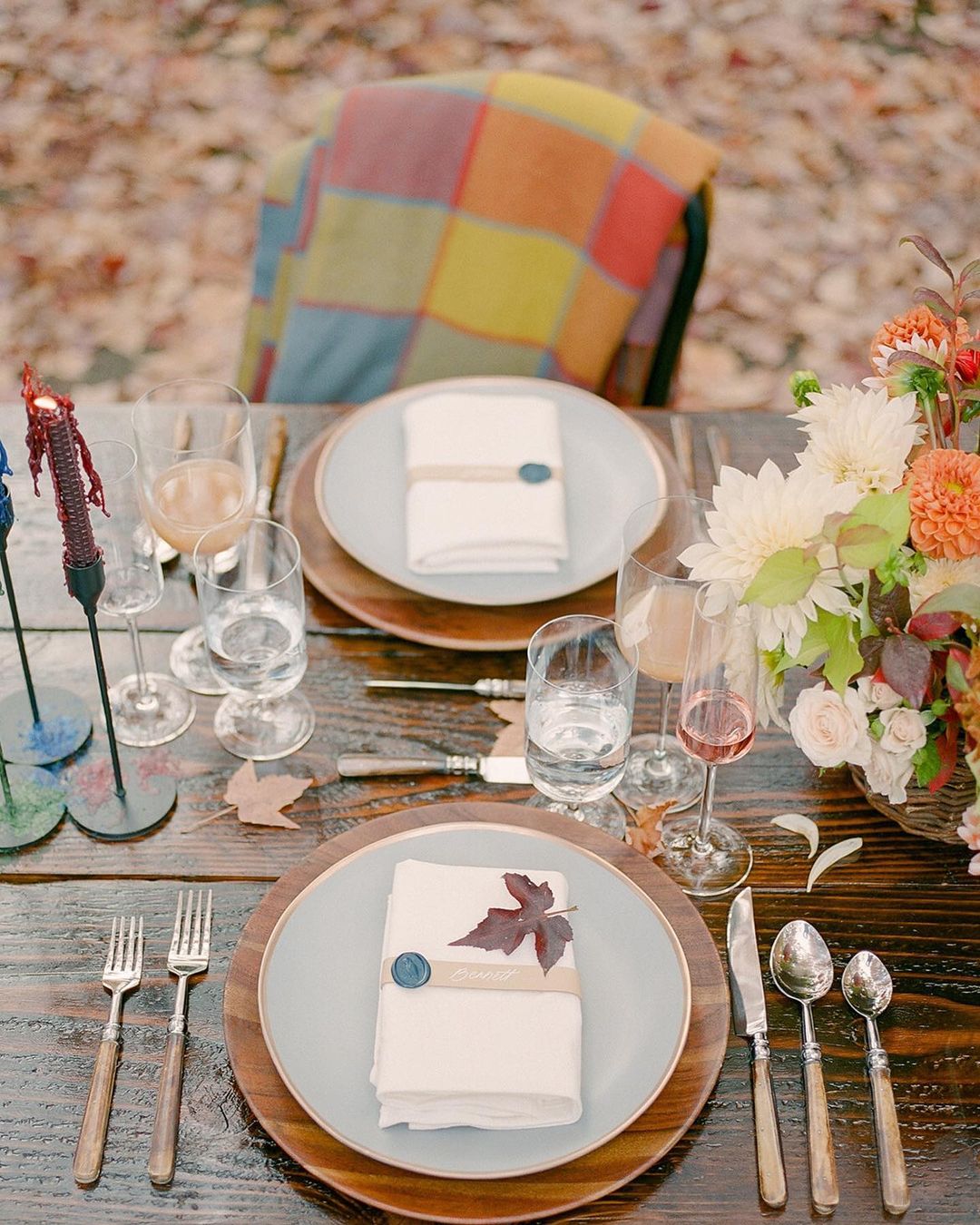 We love how the focal point of this gorgeous table is that dark woodgrain; it’s the perfect backdrop for a rustic look, especially with the accent of those charming wood chargers. It could be easy to go over-the-top with this theme, but the addition of non-traditional plaid throws tossed over each chair and the clean, bright flowers (in tones of warm red, burnt orange and pops of fresh cream) ties everything together in a way that feels just right.