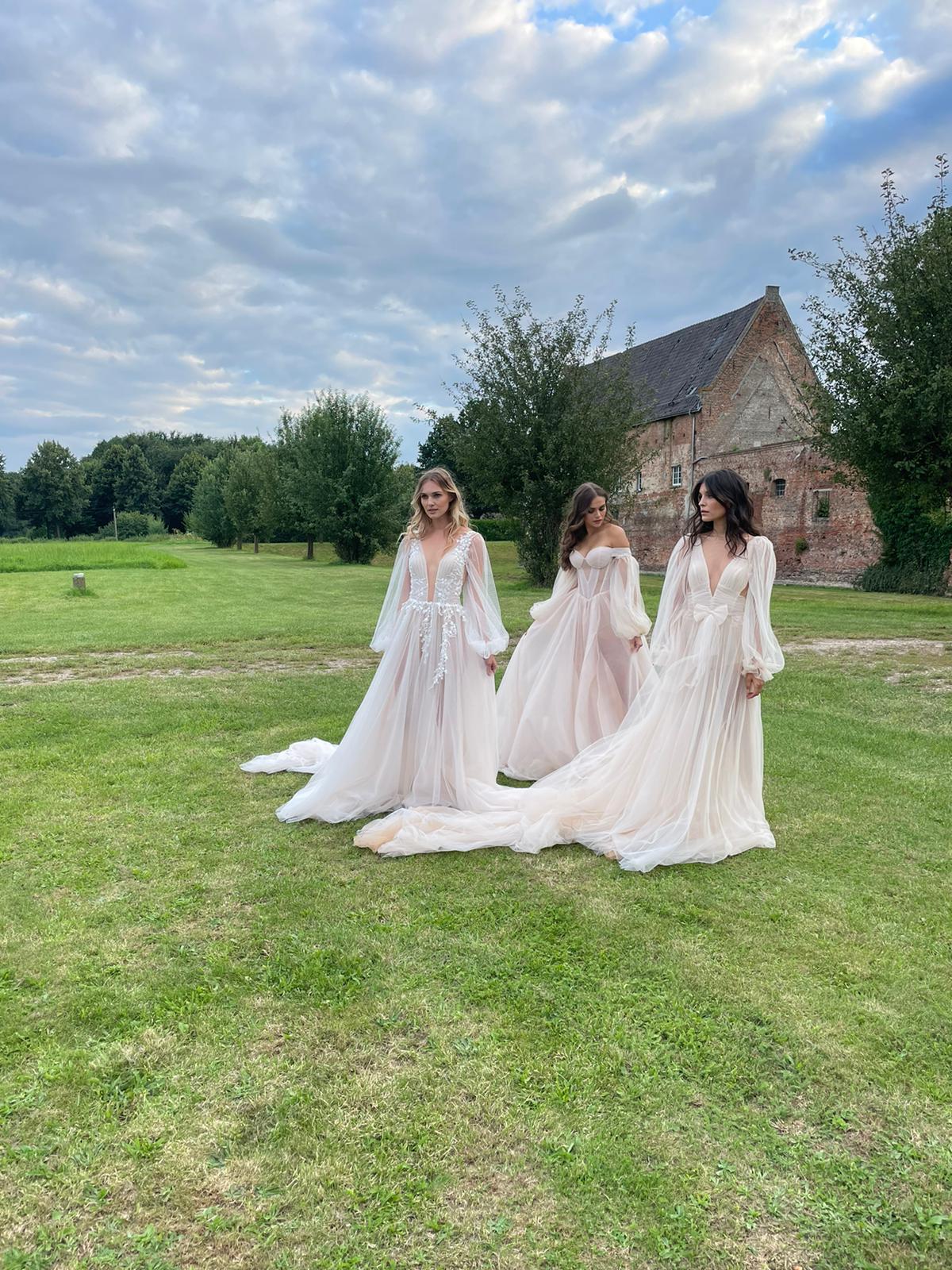 This mini collection of dreamy, ethereal gowns features soft, fluid silhouettes; sheer poet sleeves; and carefully-chosen, luxurious fabric. The collection includes a tulle, A-line ballgown with long, off-the-shoulder sleeves and a pleated neckline and insets on the bodice that’s a little bit tailored and all out fanciful . A tulle, fit-and-flare dress embellished with dainty 3D florals is its own garden party. A sheer, Swiss-dotted tulle gown with a plunging neckline and subtle floral embroidery is soft, yet glamorous. And a pleated tulle, long-sleeved A-line dress with a deep V-neckline brings on the charm with a delicate bow at the waist.
