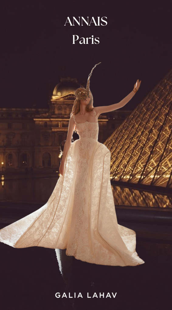 This gown encapsulates the essence of Victorian style, offering a fresh interpretation of timeless elegance. Illuminated by the timeless allure of Paris, Anais seamlessly blends the majestic history of the city with the symbolic brilliance and romance. Exquisite fitted corded French lace mermaid gown with a daring sheer corset back. The angel wing neckline and delicate thin straps as well as the pointed train infuse a touch of drama. Complete the look with an impressive constructed overskirt.
