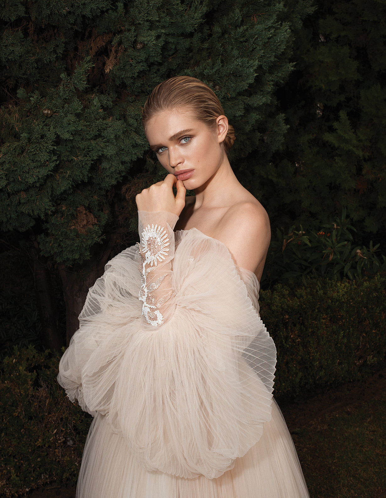 Make a serious statement with the billowing sleeves of our Bellina gown, one of our 2019 Bridal Couture dresses. Delicately pleated silk tulle floats from an off-the-shoulder neckline, finished with a hand-beaded cuff. Custom made to fit your body like a second skin, Bellina’s sheer draped bodice is set atop a full and flowing skirt, the princess wedding dress of a fashion-forward bride’s dream.