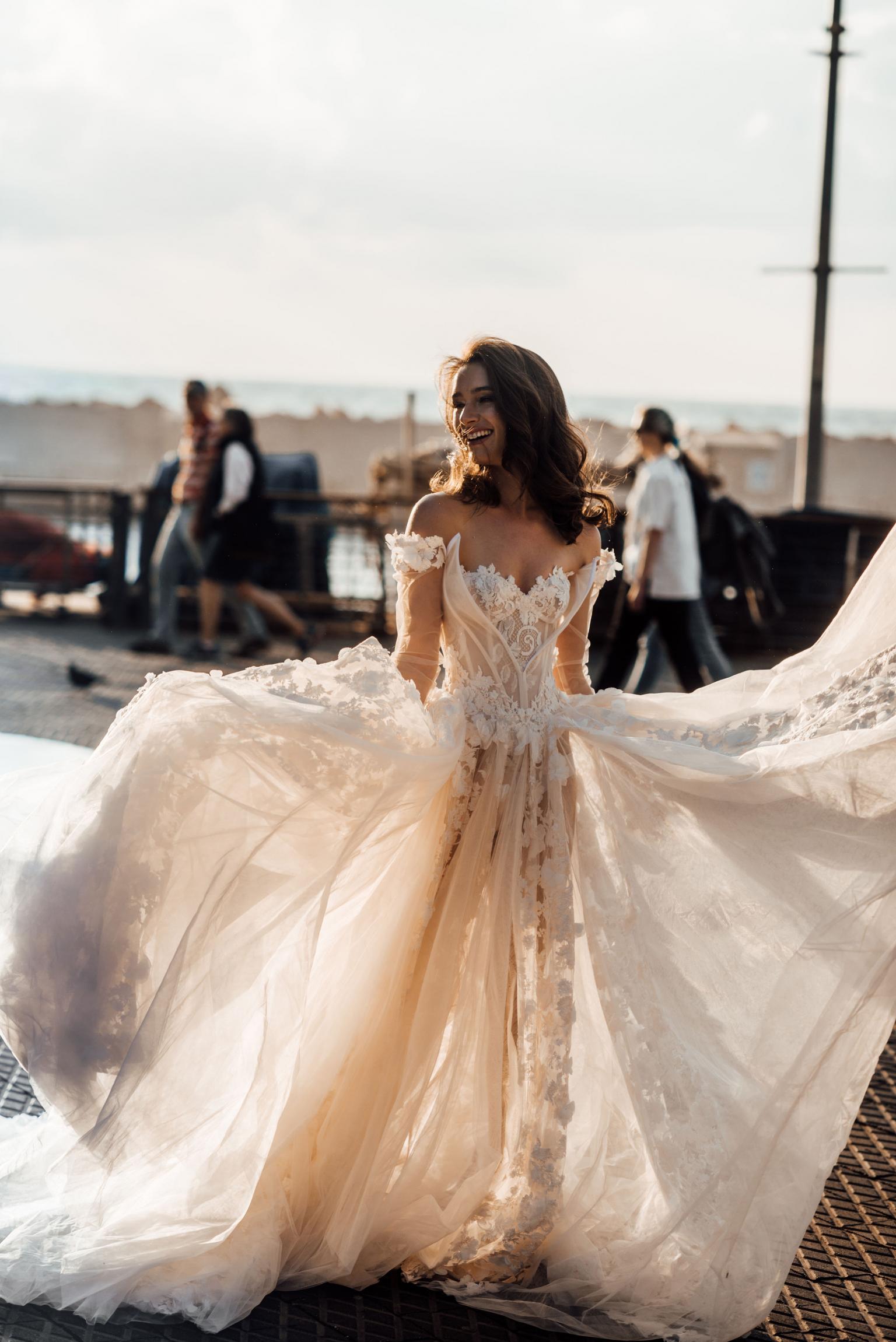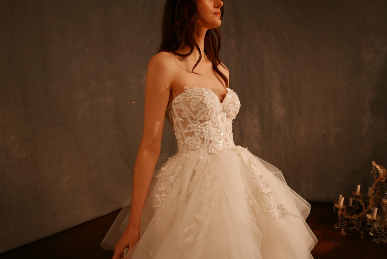 While this detail is surely not revolutionary, the Galia Lahav take on detachable extras is distinctly loyal to the romantic thread that links the entire Make a Scene collection. “I try to find a way of giving the drama and then getting rid of it afterward,” explains Sever. He applied that notion to sleeves, bustles and even side panels. For the bride who likes options but still wants to have a traditional silhouette—or simply just wants a dress that can evolve with her wedding—there’s something here for her. For example, the removable bustle on the Serena dress was made from a spiral of ivory and blush, adding even more depth to the volume. And for a dramatic asymmetrical effect, a train is affixed to the left side of the Michelle dress, elegantly cascading down the gown with two-tone tulle affixed with appliqué.