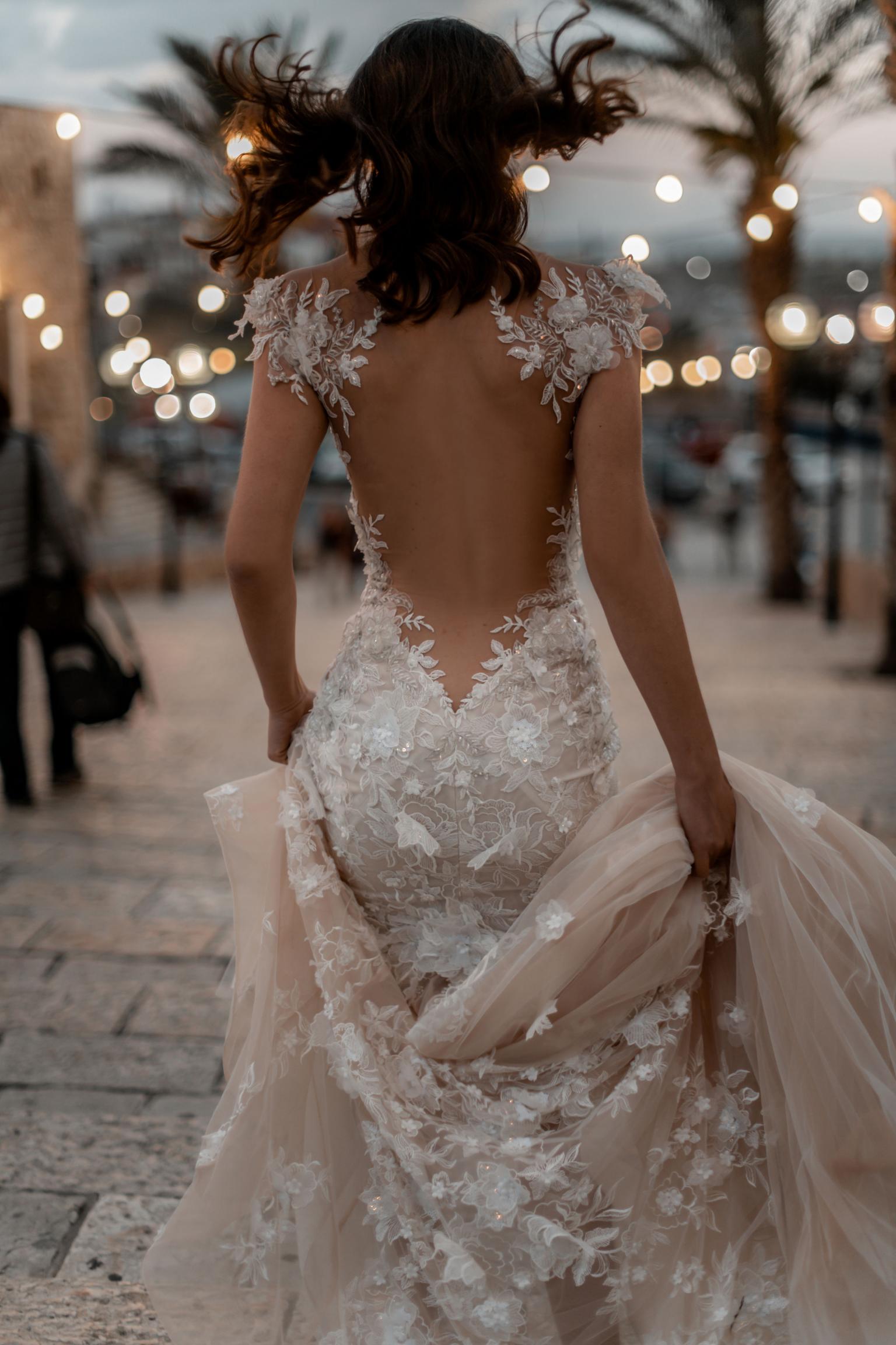 This was the first season that traditional French guipure was used and on the Lindsay dress, two types of the motif-heavy lace were layered. Placed over organza, a 3D floral effect is created, with blossoms starting at the plunging sweetheart neckline and drifting all the way down to the edges of the mermaid train. And where you see lace, well, you might be tricked. Plenty of the dresses are actually hand-embroidered, replicating the look of the delicate adornment with an even more spectacular touch. Consider Martha as the most brilliant interpretation of this, with a tumbling cascade of white flowers that are intricately woven into the off-the-shoulder bodice and stunning skirt.