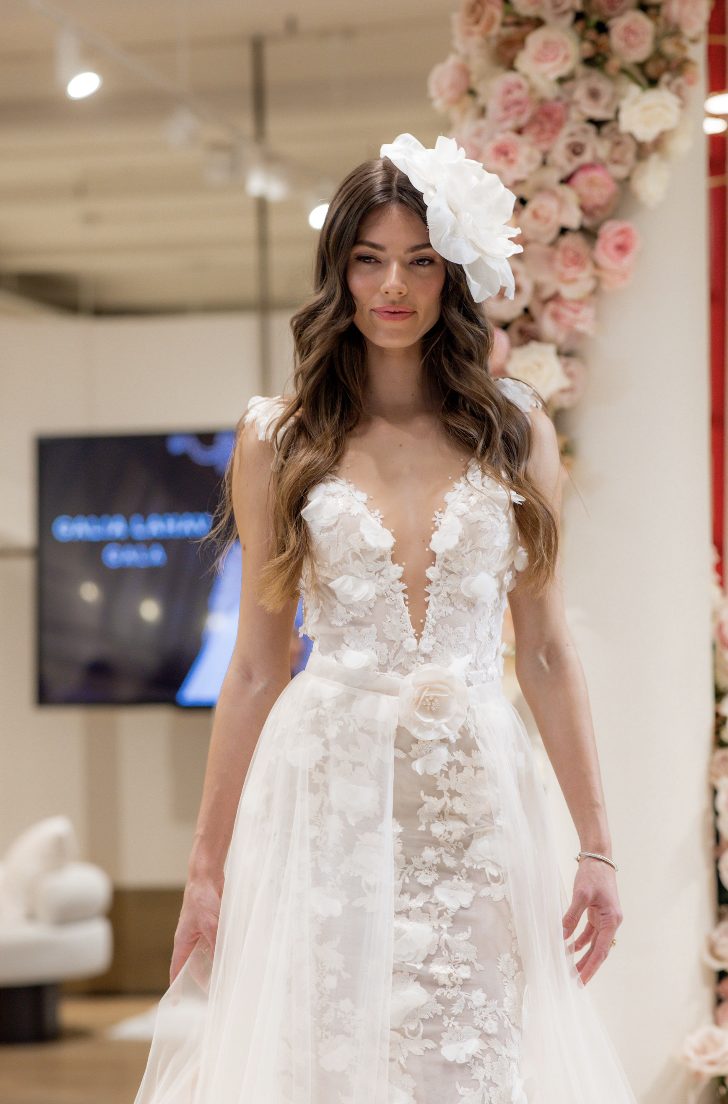Gowns that allow a bride to change up her look throughout the day are a trend that’s still going strong. Removable tops, sleeves, and overskirts let you to take your dress from ceremony to reception to the after party—and wow everyone at each stage. Detachable illusion sleeves and a satin overskirt on the Noel French lace gown reveal a fitted mermaid silhouette. The April vintage lace trumpet gown is accessorized with detachable tulle sleeves and a dramatic overskirt with a pearl-detailed belt. And the Freya mermaid gown, embellished with beaded 3D flowers, features a detachable half overskirt and illusion sleeves.