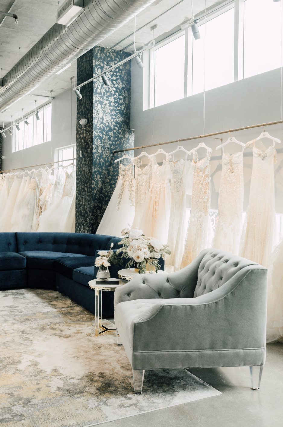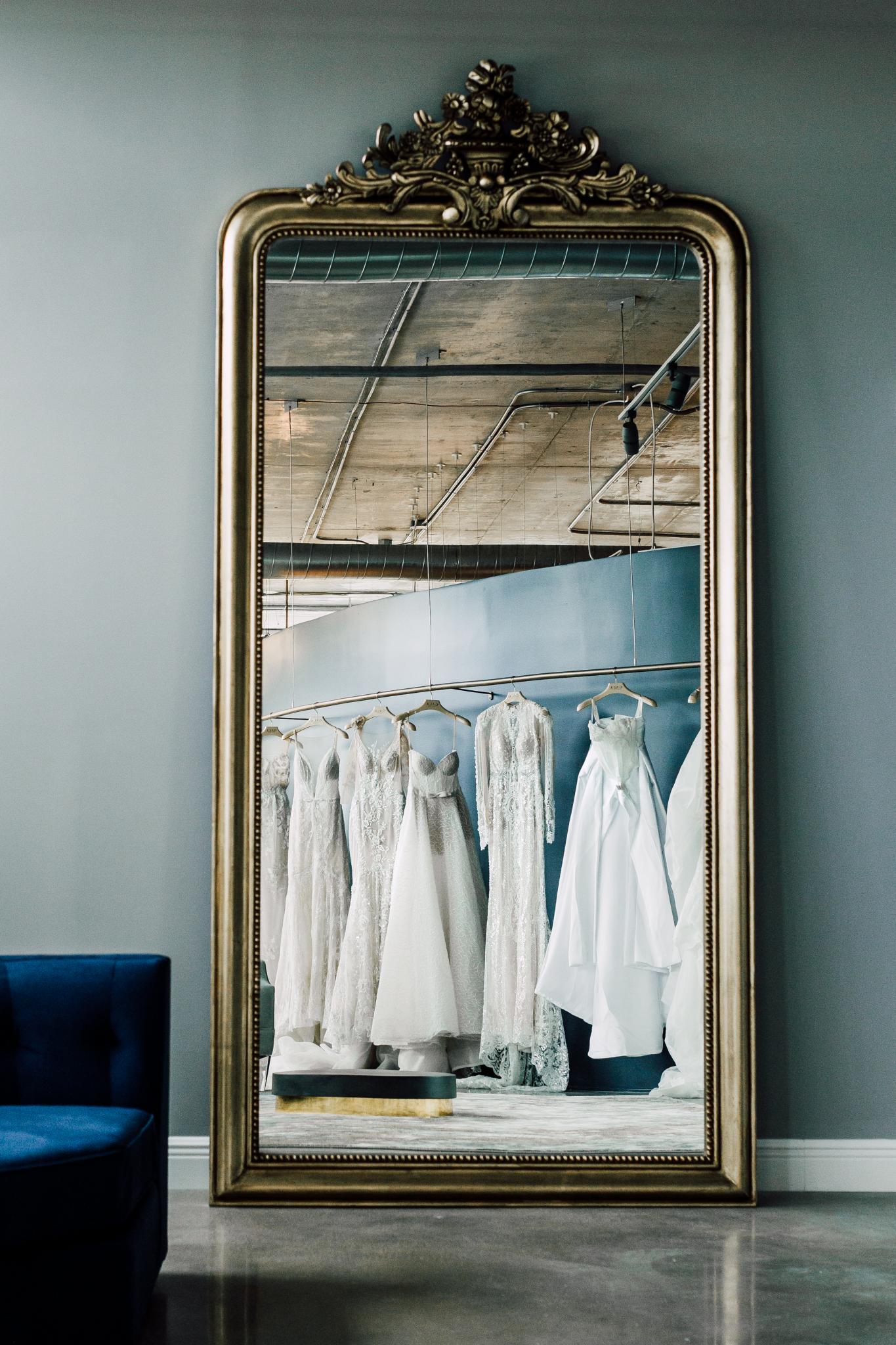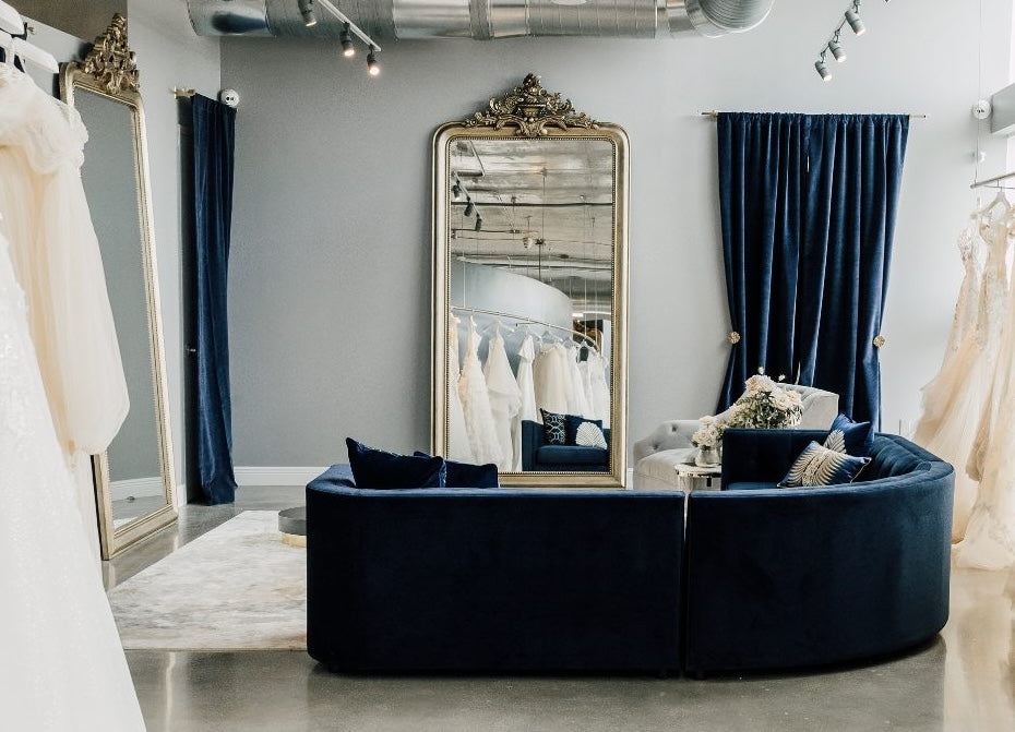The Miami Flagship was inspired by our brand DNA and our Los Angeles Flagship Salon. We wanted a space that had beautiful lighting, an edgy design and felt like a private comfortable space for our brides to have an unforgettable experience. With dark blue curved accent walls, gold baroque oversized mirrors and windows lining the entire space our brides are surrounded by light and beauty.