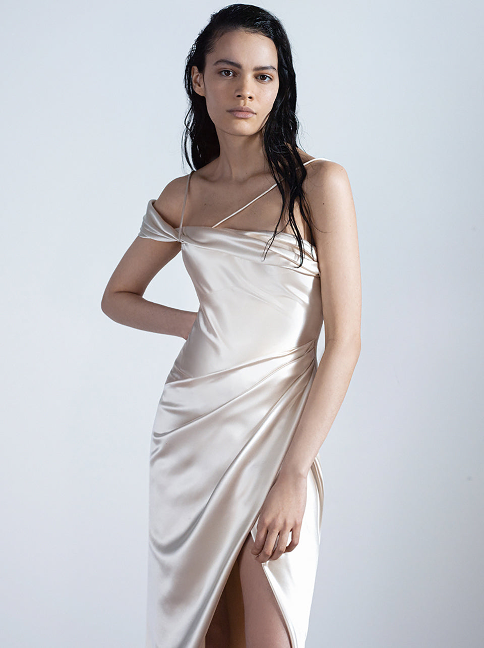 Meanwhile the dresses celebrate the dynamic range of weather and nature – two elements that need each other to exist in a beautiful dance of power and harmony. Elise is the sexy and sophisticated slip dress with everything to offer. It details with an offset neckline, perfectly draped silk, and thigh high slit exuding strength and glamour in a modern-meets-old-hollywood affair. Eloise is a dream cloud of draped tulle, as the mini party dress that won’t let you forget her extravagance with a perfect trainlike detail. And Jasmine comes in like a shimmering rainstorm of metallic wonder, while Liana is the parting of the clouds.