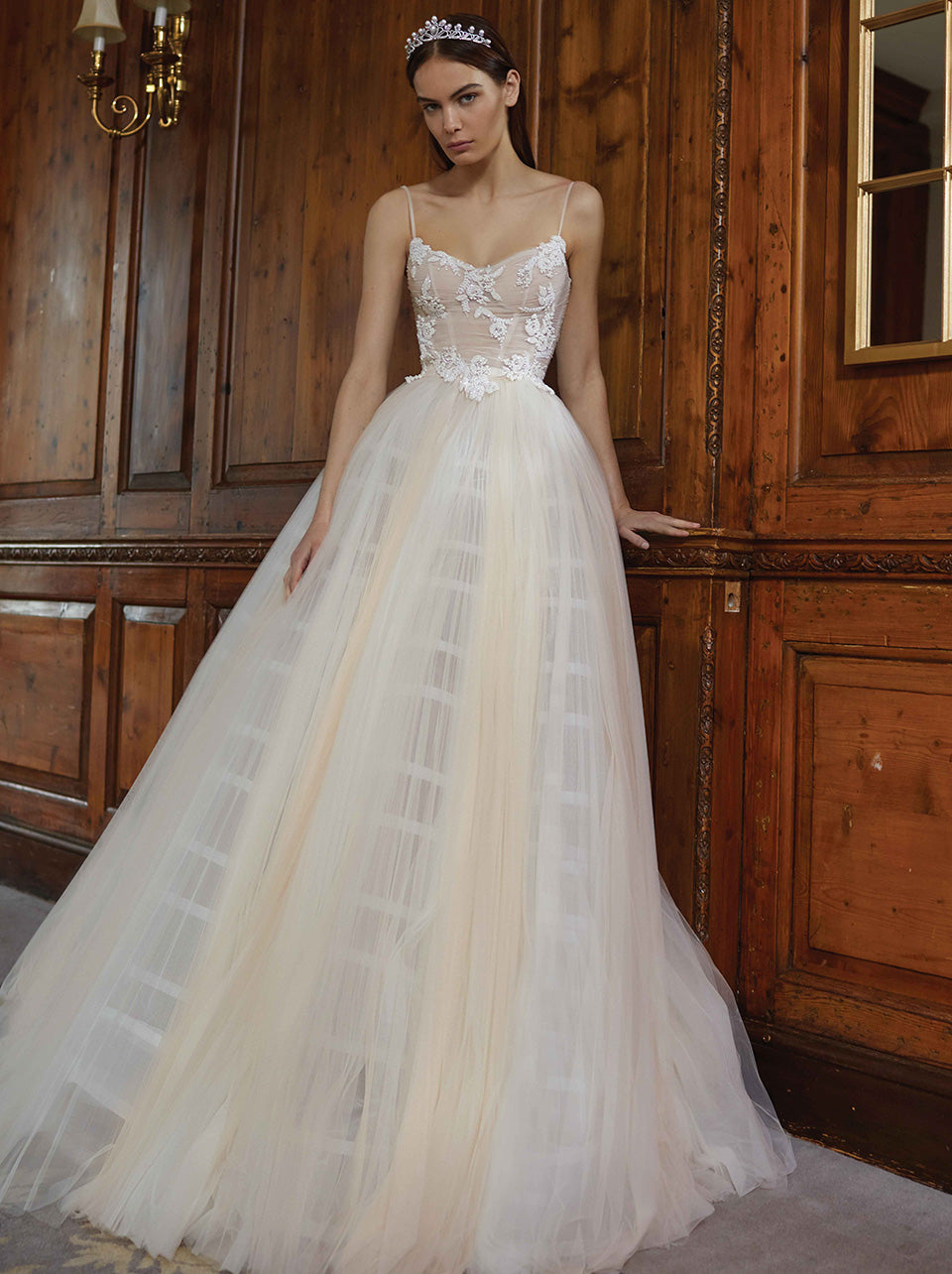 Further, each gown was designed to move just as effortlessly as a pirouette. While the voluminous silhouettes are downright dramatic, they’re constructed out of light-as-air fabrics for total freedom of movement. That’s thanks to the use of detachable petticoats and overskirts that add minimal weight to a show-stopping look. And those tulle skirts? Well, of course they’re an interpretation of the classic tutu. For the bride who prefers to shine like the prima ballerina she is, there are skirts of illusion fabric dotted with rhinestones and nude tulle adorned with sparkling crystals.