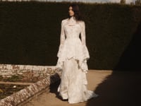 Ally is a fitted mermaid dress made from French lace with shimmering lurex cording that catches the light in the most magical way. The basque-waisted corset top features a soft scoop neckline, balancing romance with modern edge. The skirt flows effortlessly, sleek yet dreamy, giving the whole look an airy softness that feels both chic and unforgettable.