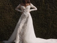 A daringly sheer corded French lace dress embroidered with pearls, blending sensuality with charm. The basque-waisted corset top shows off a bold sweetheart décolleté, while delicate draped tulle accents highlight the neckline and the sharp lines of the corset. Sheer, fitted lace sleeves add a touch of elegance while keeping the look light and modern. Finished with a sleek, semi-sheer mermaid skirt, Teddy is daring, playful, and irresistibly fresh.