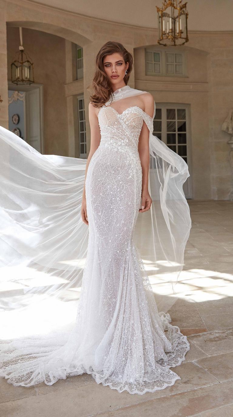 If ever there was a wedding venue that requires a certain amount of provisions from your dress, it’s a beach wedding. Saying your nuptials while barefoot on the sand and in front of a majestic ocean backdrop is truly magical. To make sure it feels as good as it looks, you’re going to want to choose a wedding dress that is light and ethereal, allowing you to look and move effortlessly on the sand. To be the ultimate bohemian beach bride, we love the Maya dress with it’s semi-sheer fabric, off-the-shoulder straps and mermaid silhouette. Compliment the look with loose mermaid waves, bronzed skin and a bouquet of pampas grass.